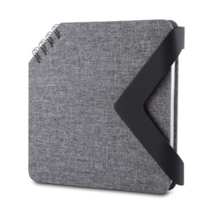 Bloco de anotações com capa dura revestida em papel especial e fita elástica para fechamento. Possui cerca de 80 folhas pautadas, além de um bloco com aproximadamente 20 folhas autoadesivas amarelas e por volta de 100 marcadores de página autoadesivos, divididos em cinco cores diferentes. Acompanha uma caneta esferográfica com carga azul de 1.0mm e acionamento por clique, corpo em papelão e demais componentes em plástico.