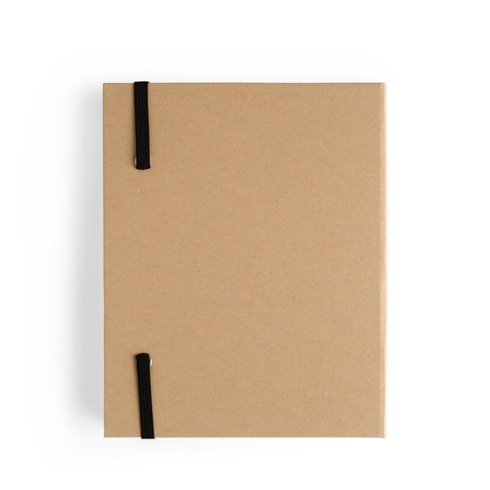 Bloco de anotações com capa dura em kraft e fechamento por elástico. Possui aproximadamente 80 folhas de tonalidade marfim sem pautas e cinco canetas coloridas de ponta dupla: uma fina e outra tipo pincel.