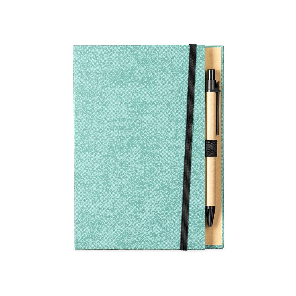 Bloco de anotações com capa dura revestida em papel especial e fita elástica para fechamento. Possui cerca de 80 folhas pautadas, além de um bloco com aproximadamente 20 folhas autoadesivas amarelas e por volta de 100 marcadores de página autoadesivos, divididos em cinco cores diferentes. Acompanha uma caneta esferográfica com carga azul de 1.0mm e acionamento por clique, corpo em papelão e demais componentes em plástico.