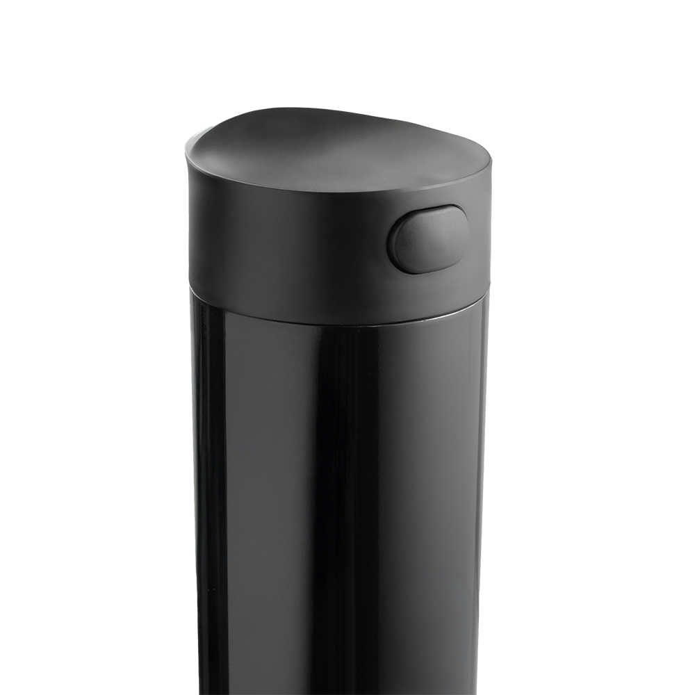 Caneca térmica em aço inox com parede dupla e isolamento a vácuo, capacidade de até 450 ml e acabamento brilhoso. Possui tampa rosqueável com anel de silicone.