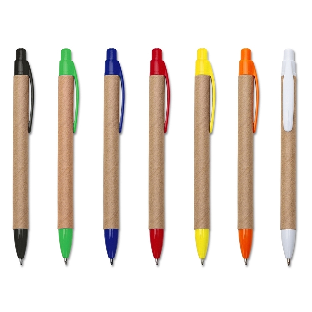 Caneta de papelão com detalhes plásticos, carga esferográfica azul 1.0 mm e acionamento por clique.