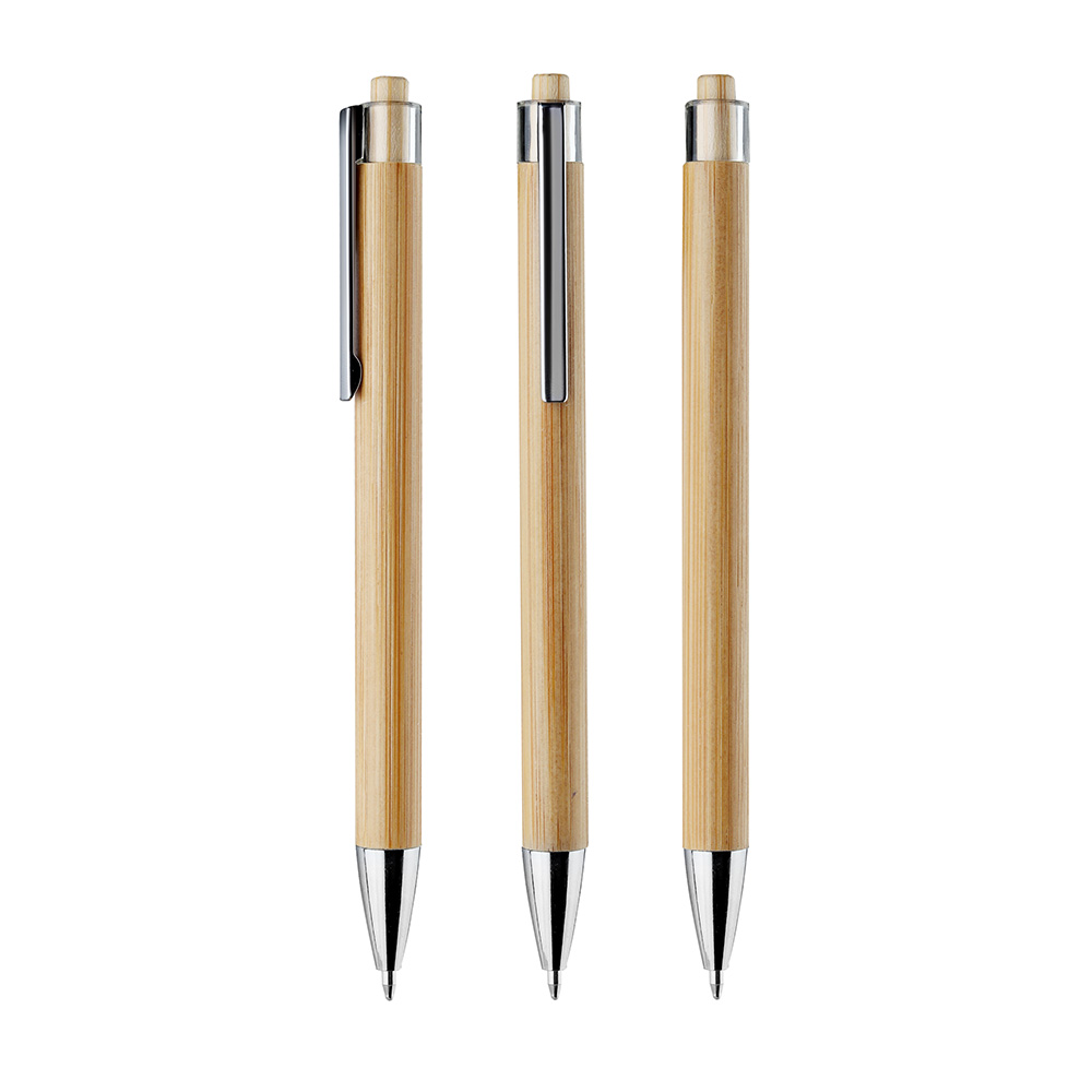 Caneta com corpo em bambu, acionador em bambu com detalhe plástico, ponteira e clipe cromado.
