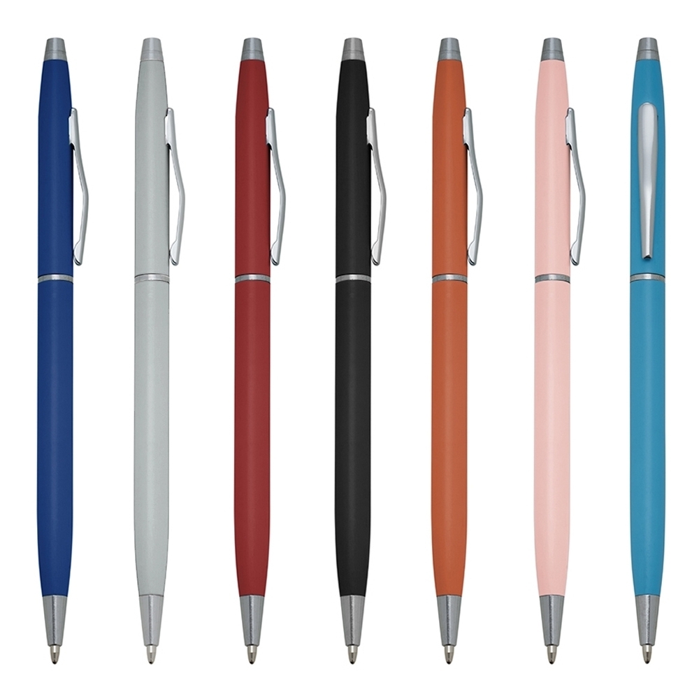 Caneta metálica com carga esferográfica azul 1.0 mm e acionamento por rotação.