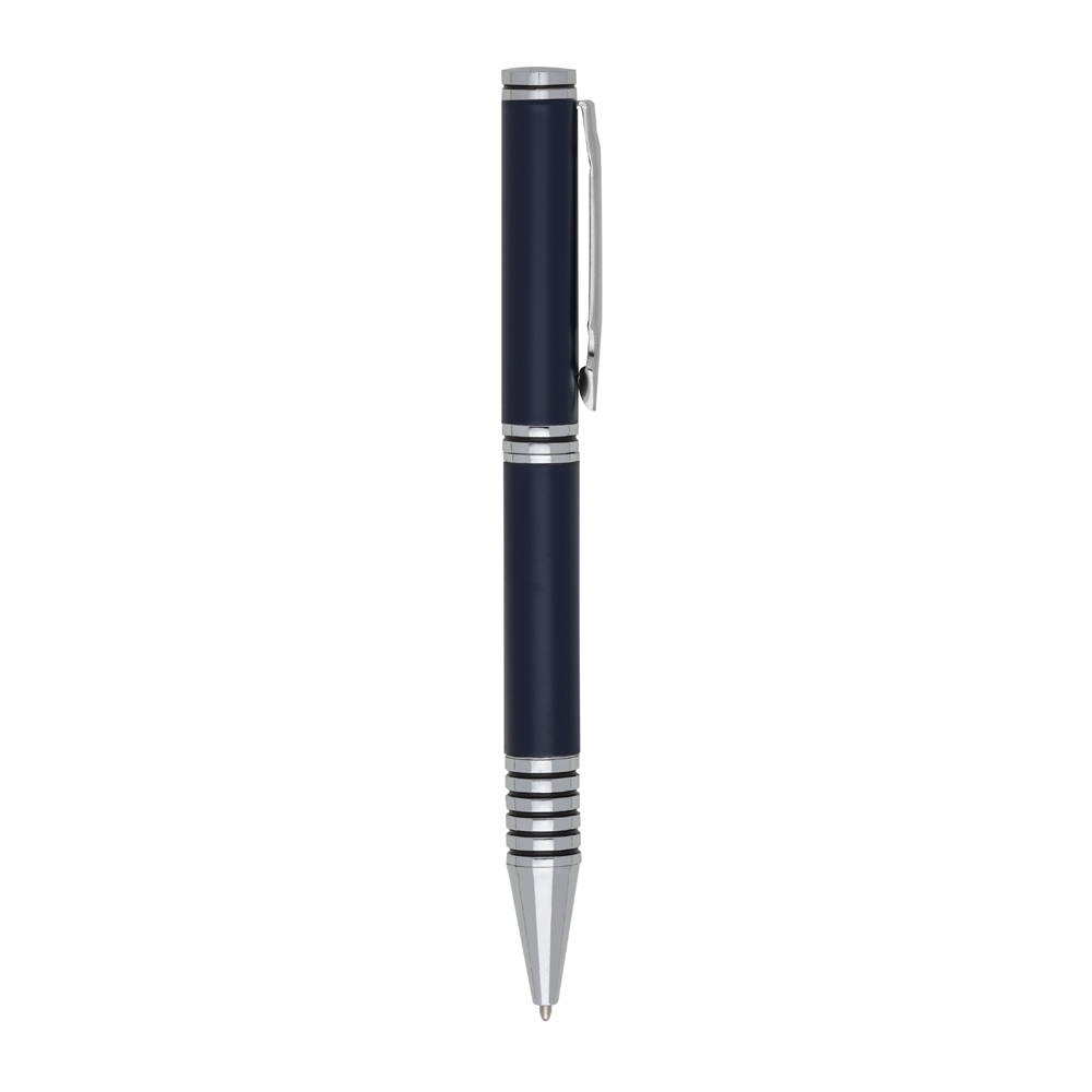Caneta metálica com carga esferográfica azul 1.0 mm e acionamento por rotação.
