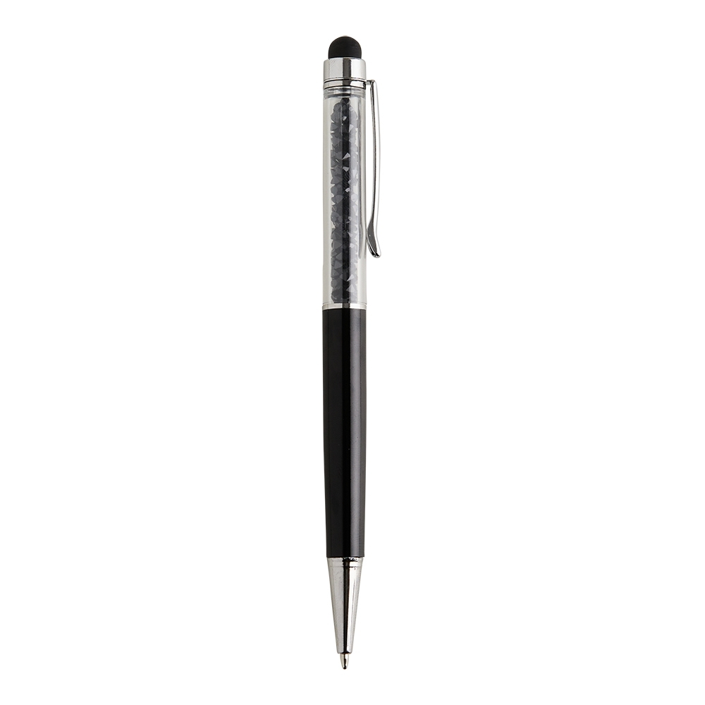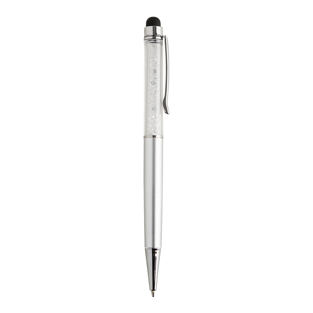 Caneta plástica com touch screen e detalhes em cristal, acionamento por rotação e carga esferográfica azul 1mm.