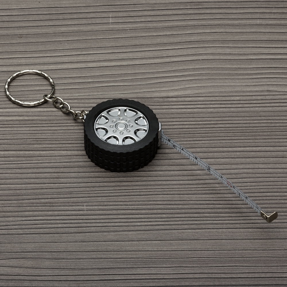Chaveiro plástico em formato de pneu de carro e argola metálica. Possui uma trena com fita de alcance máximo de 1 metro, além de exibir suas medidas em pés e polegadas.