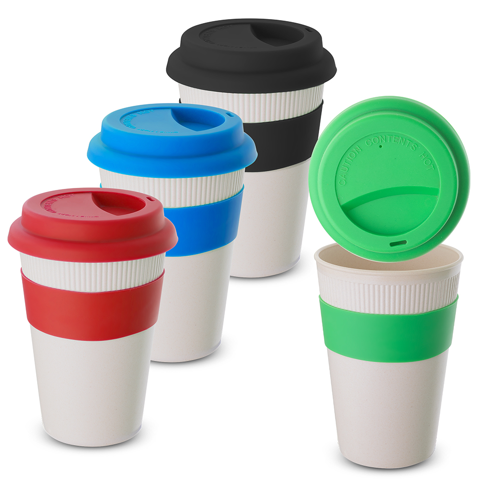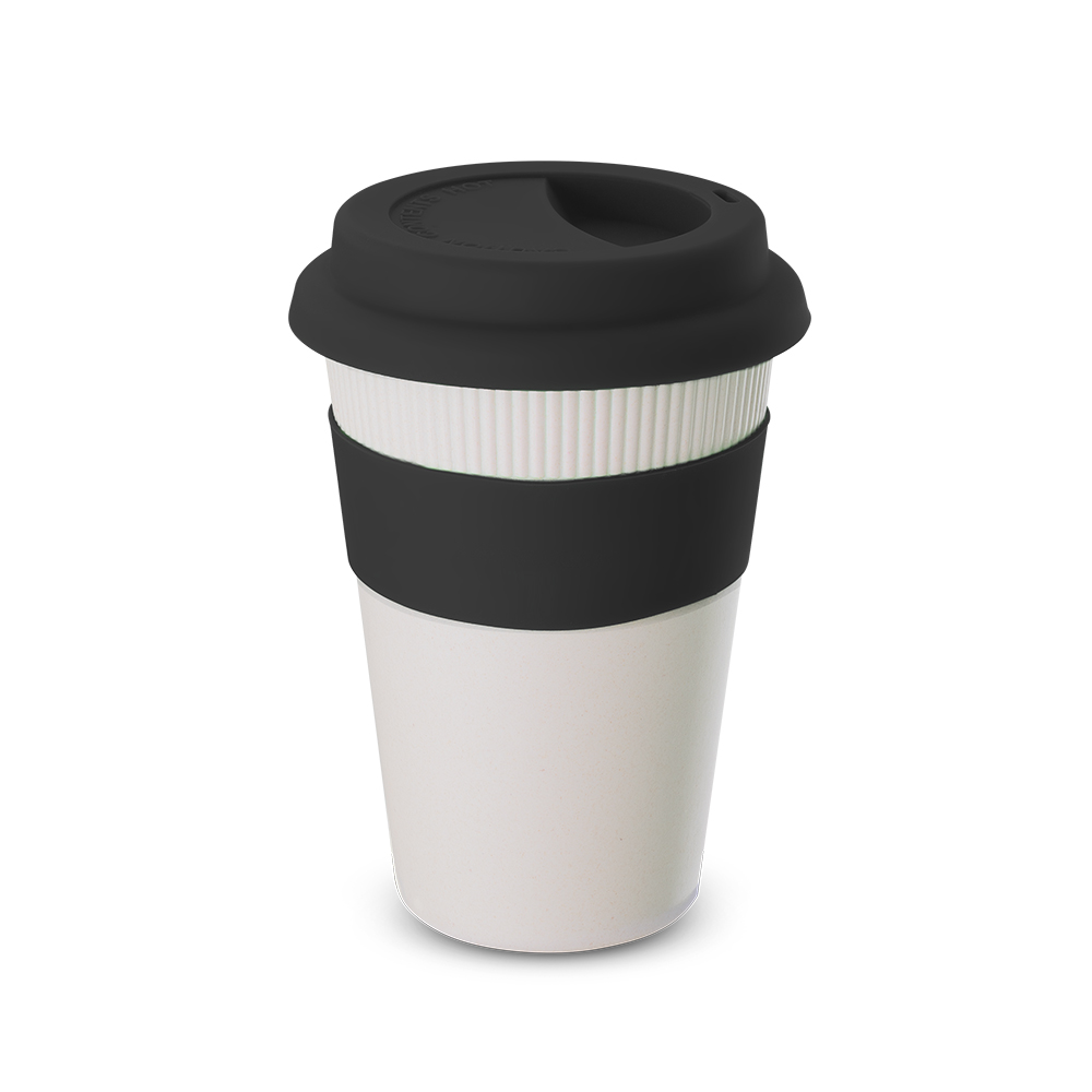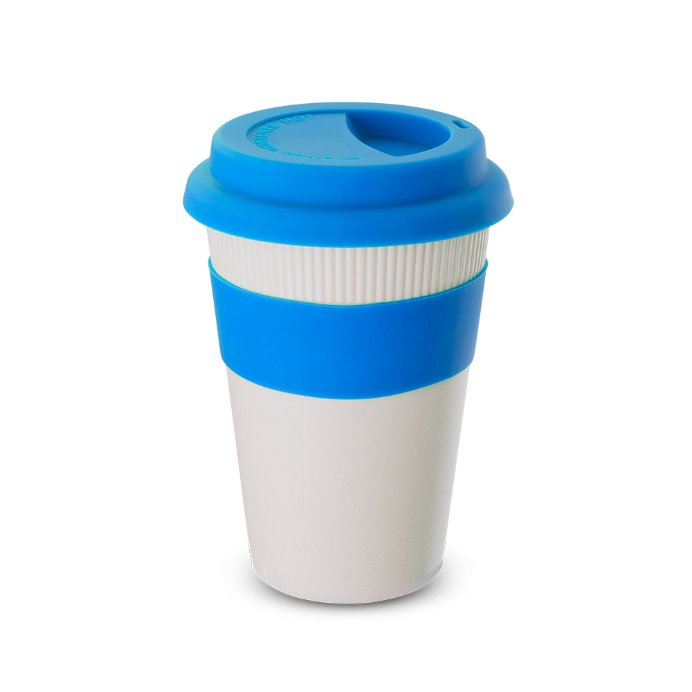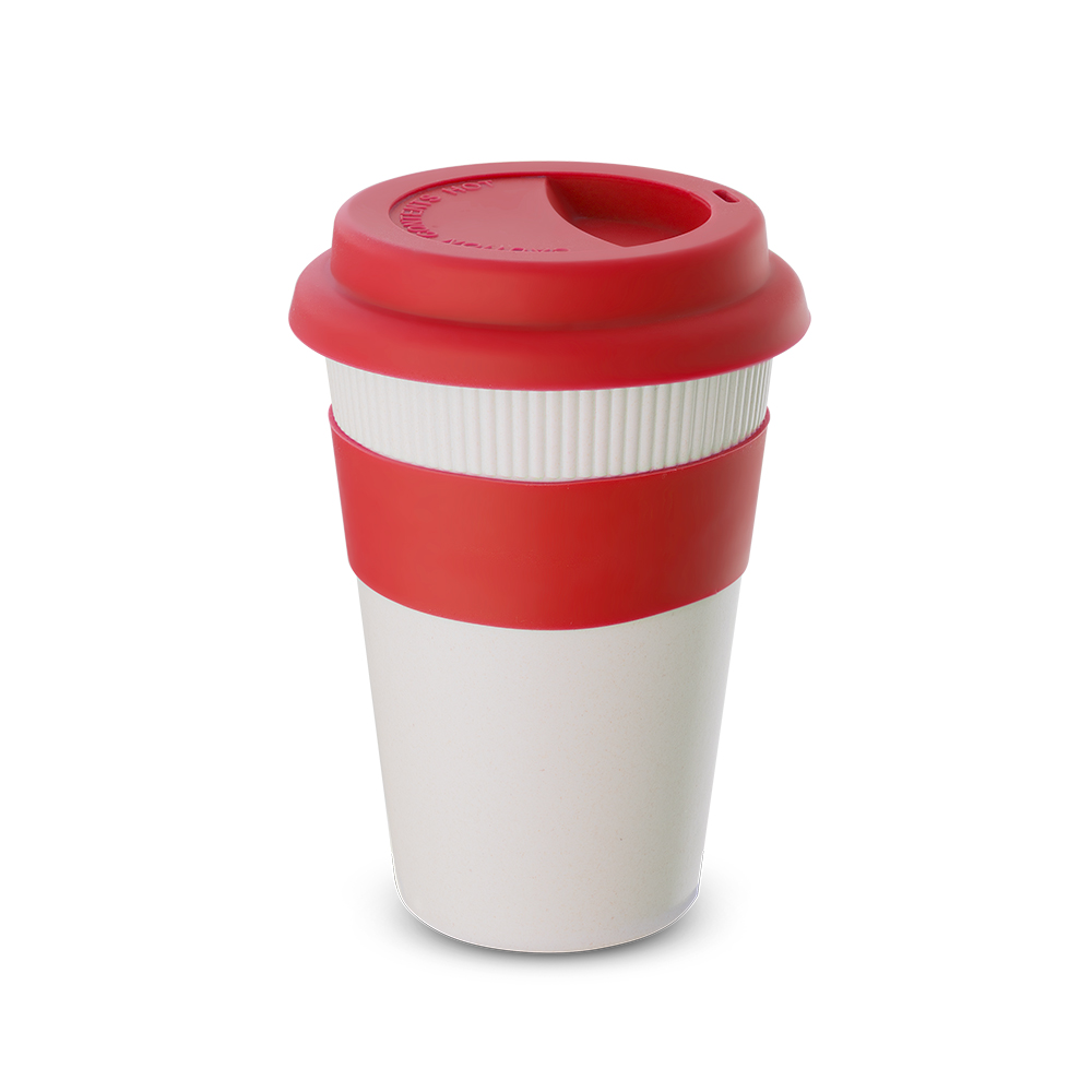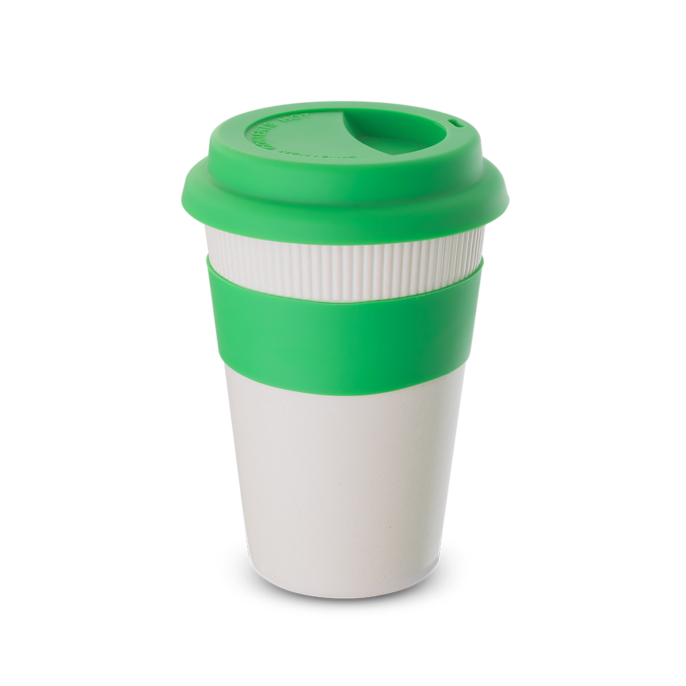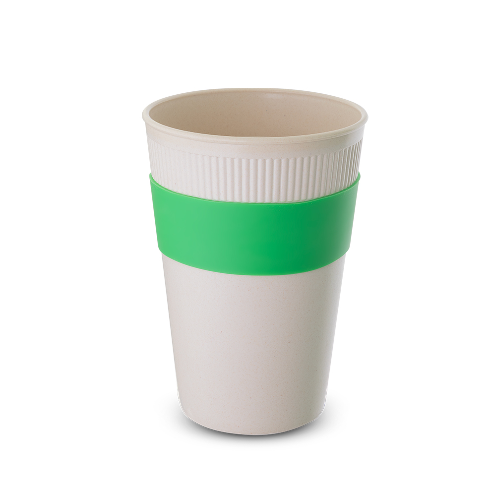 Copo em fibra de bambu com pegador e tampa em silicone, capacidade 450ml. Composição: 30% de fibra de bambu e 70% de PP.