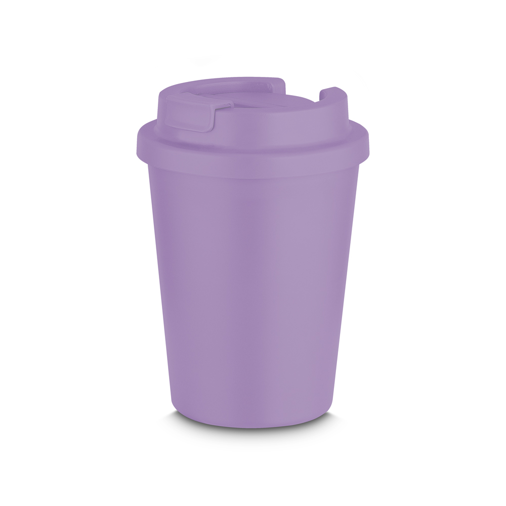Copo plástico produzido em Plástico RPET, permitindo ir ao microondas, com capacidade de 400ml, tampa rosqueável.