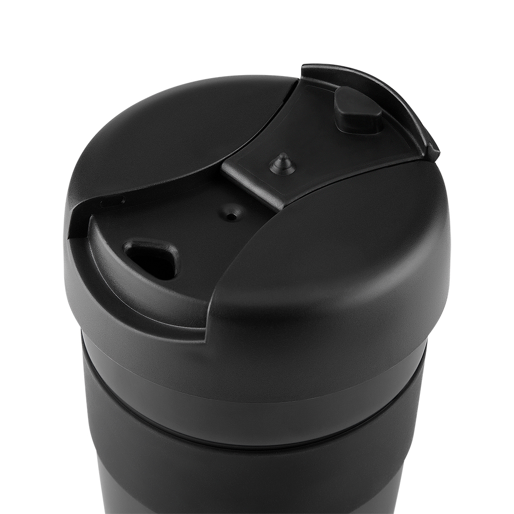 Copo em aço inox com parede dupla isolada a vácuo com capacidade de até 350ml. Conserva temperatura quente ou fria, pegador em silicone, tampa com rosca e anel de silicone para vedação.