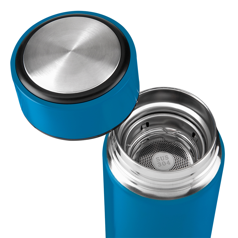 Garrafa térmica em aço inox com parede dupla isolada a vácuo, com capacidade até 450ml. Tampa rosqueável com anel de silicone para vedação. Possui infusor para chás.