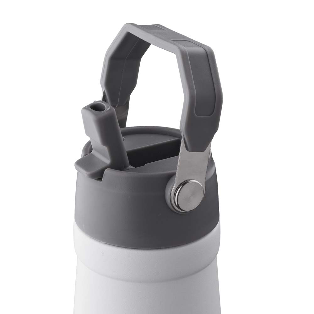 Garrafa térmica em aço inox com parede dupla Isolada a vácuo com capacidade de 700ml. Tampa rosqueável em plástico, com alça plástica para transporte. Bico por meio de sucção com canudo.