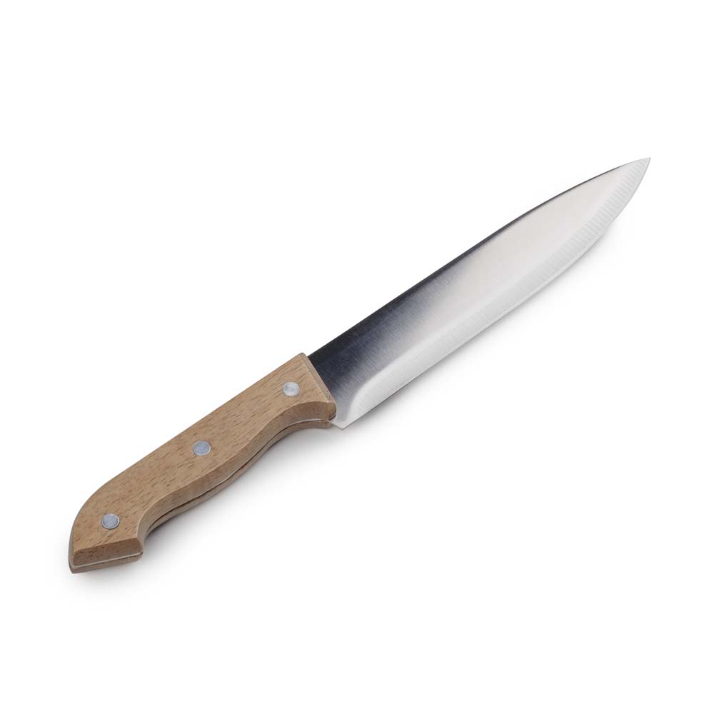 Kit Churrasco contendo 3 peças: Estojo de Nylon com alça para pendurar, uma Faca com 31,7 cm e um Garfo trinchante, ambos com cabos de madeira e aço inox.