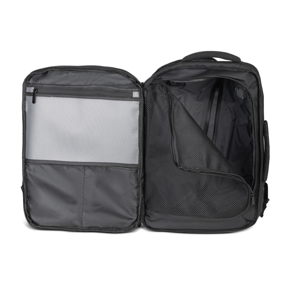 Mochila em poliéster 900D com PU e interior em poliéster 210D, capacidade de 26L. Possui divisória e zíper frontal, divisórias internas, compartimento a vácuo com bomba, zíper com expansor da mochila, espaço para tablet e notebook 15,6”, bolso lateral, cinco engates rápidos, alças acolchoadas, zíper nas costas, entrada USB e Tipo C e engate para mala.