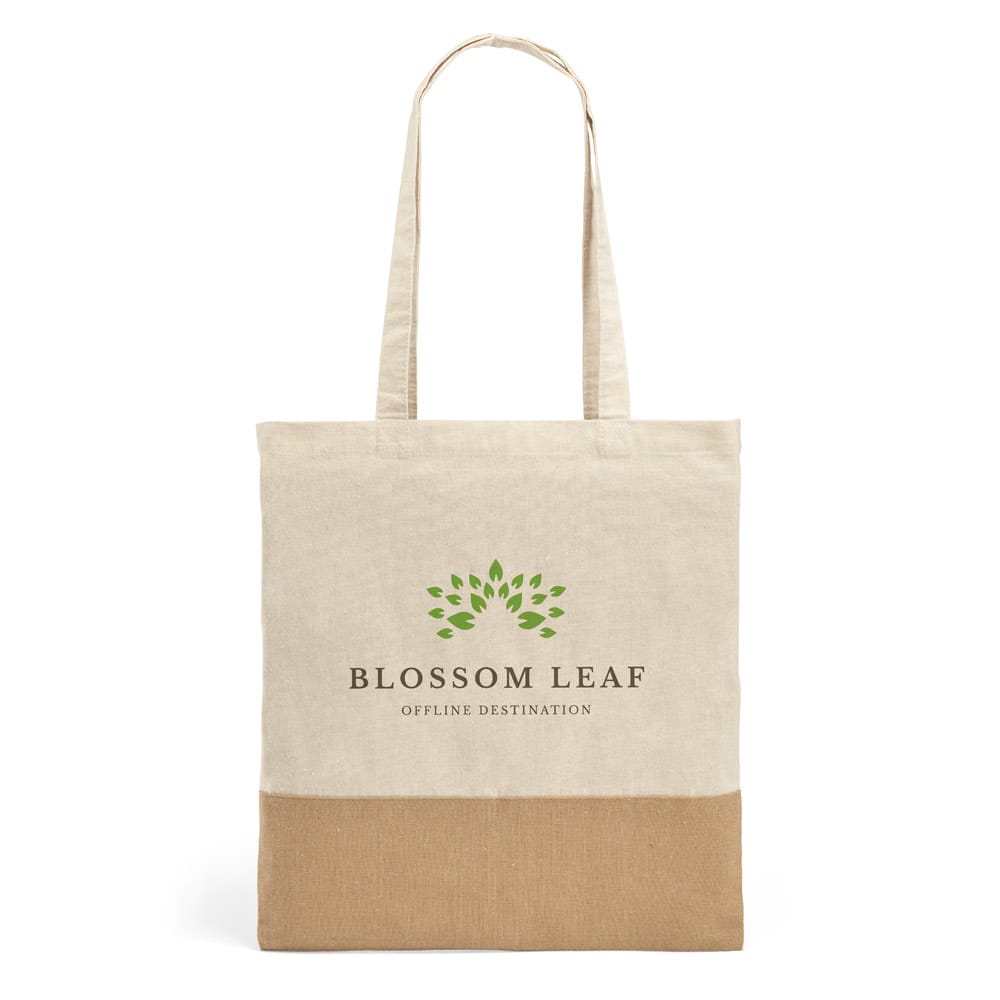 Sacola 100% algodão (160 g/m²) com detalhe em imitação de juta e alças de 65 cm. 375 x 415 mm
