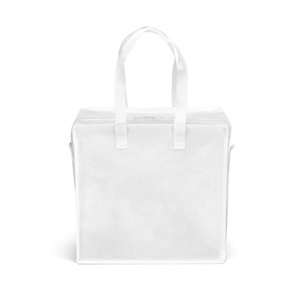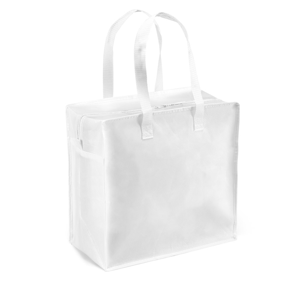 Sacola em non-woven laminado brilhante (140 g/m²) com zíper. A sacola tem encaixe para trolley, fundo reforçado e alças em webbing de 65 cm. 350 x 350 x 200 mm
