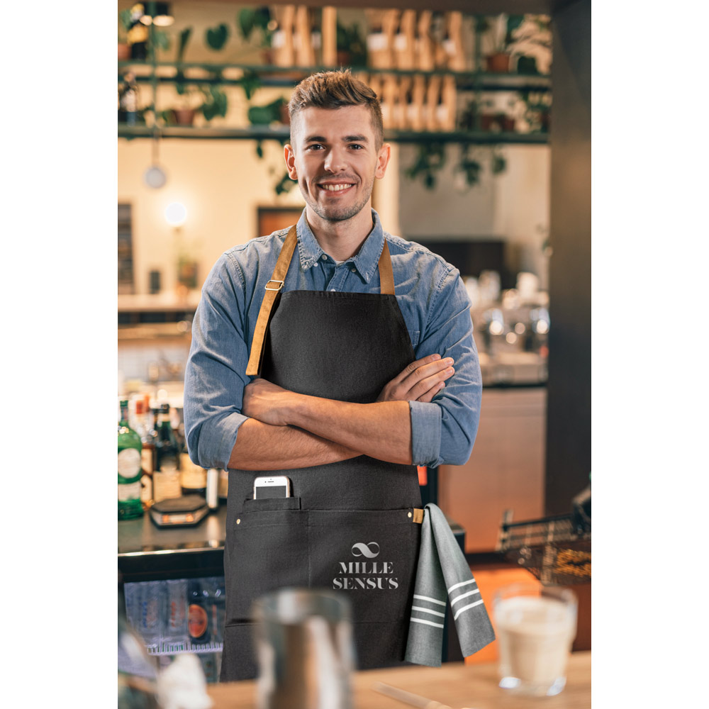 Avental em 100% algodão canvas (300 g/m²) com detalhes em metal. Com 3 bolsos multifuncionais e uma tira lateral (para suporte de um pano de cozinha). Tira do pescoço facilmente ajustável. 680 x 900 mm
