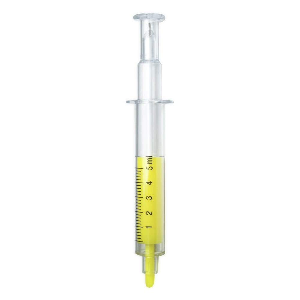 Caneta plástica formato seringa, contém marca texto e carga esferográfica azul, ambas com tampas protetoras.