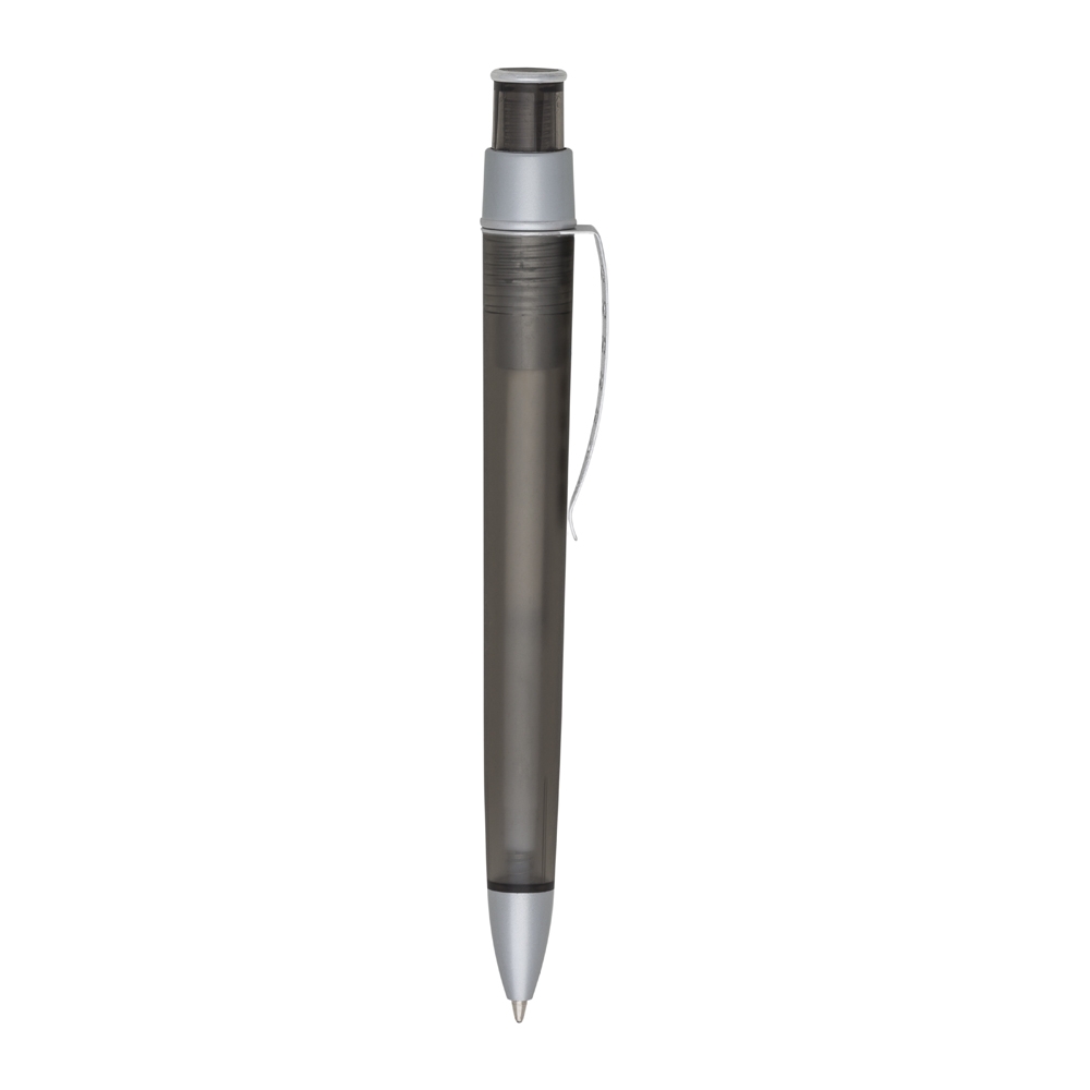 Caneta plástica com clip metálico vazado, carga esferográfica azul e acionamento por clique.