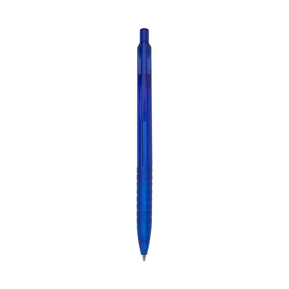 Caneta plástica translúcida com carga esferográfica azul e acionamento por clique.