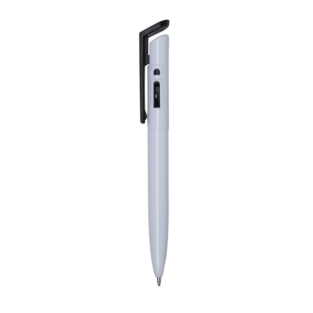 Caneta plástica com carga esferográfica azul e acionamento por clique.