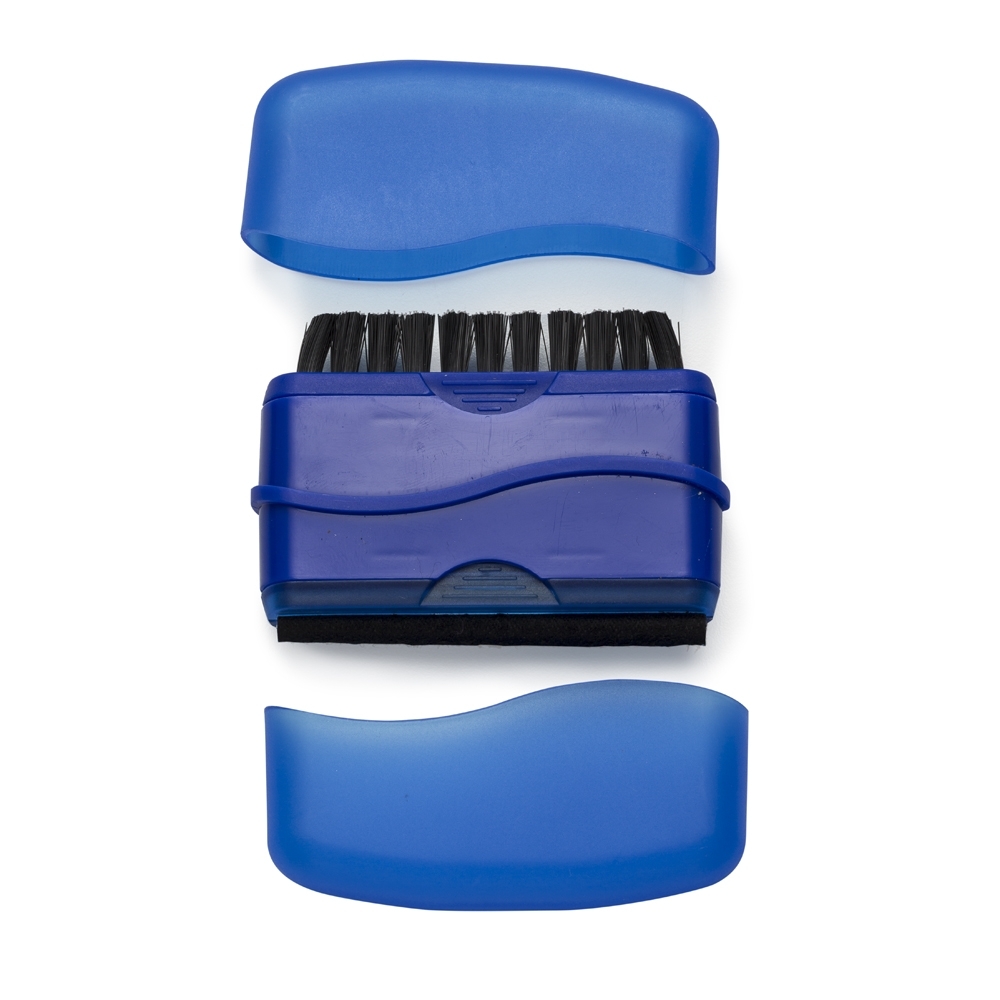 Limpador de tela e teclado, contém tampas de proteção para as cerdas e a borracha de limpeza.