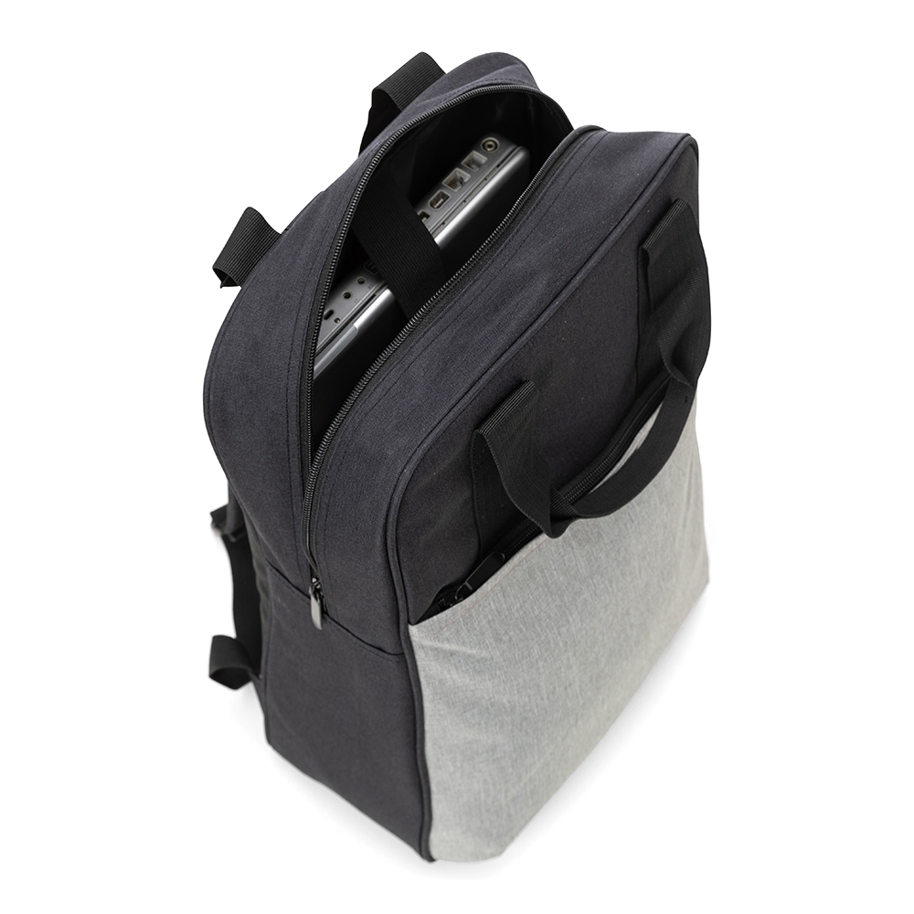 Mochila confeccionada em Poliéster com capacidade para 22 litros. Contém bolso frontal com zíper, alça de mão em nylon, suporte para junção das alças de mão, e alças para as costas ajustáveis. Possui bolso interno para notebook até 17 polegadas.