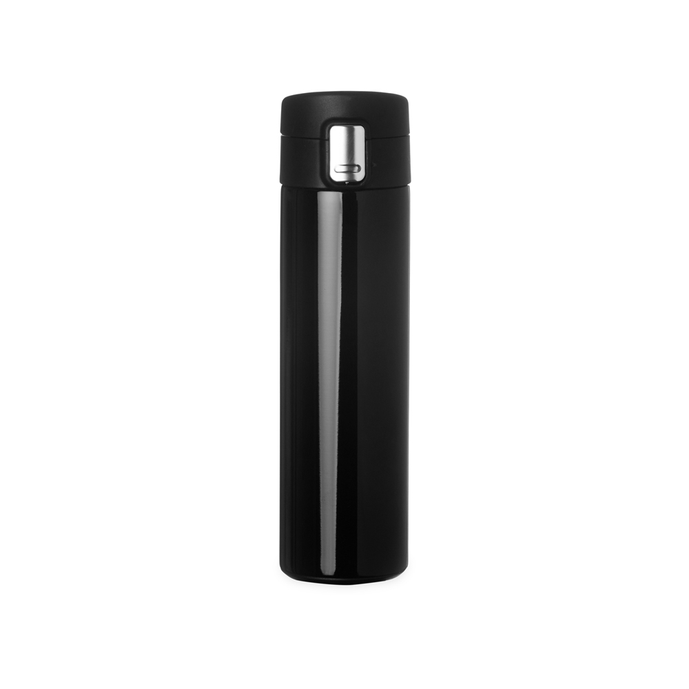 Garrafa inox 304 com capacidade de 400ml, tampa com botão de acionamento e trava de segurança.